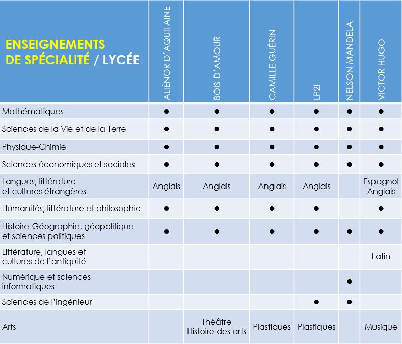 Le tableau ci-dessous vous indique l’ensemble des ES [Enseignements de Spécialité] sur chaque lycée général et technologique du Grand Poitiers.